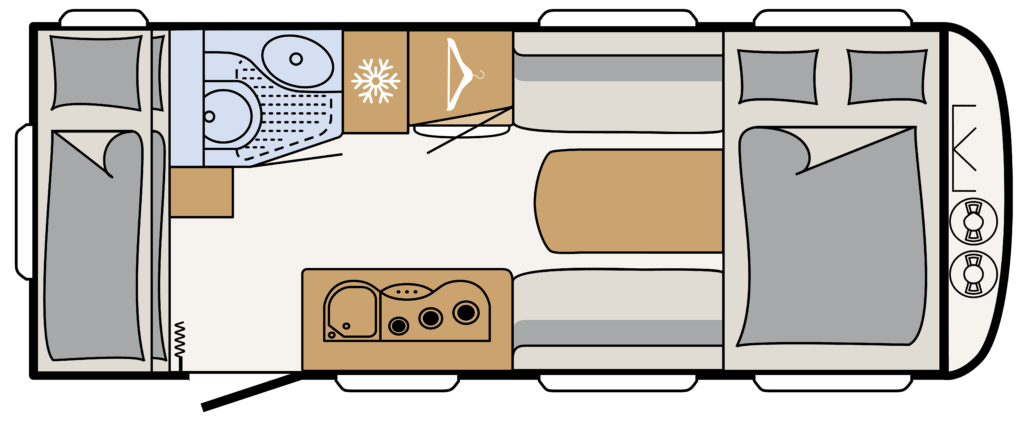 Let op! De foto`s zijn bedoeld om een idee te geven van het interieur en de sfeer van de caravan. De foto`s kunnen afwijken van de indeling en stoffering.