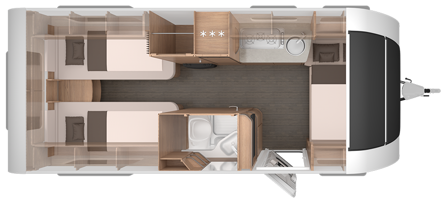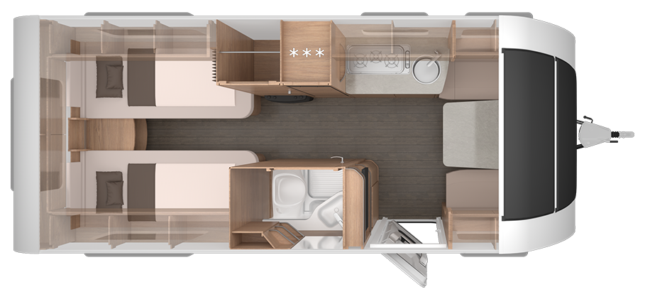 Let op! De foto`s zijn bedoeld om een idee te geven van het interieur en de sfeer van de caravan. De foto`s kunnen afwijken van de indeling en stoffering.