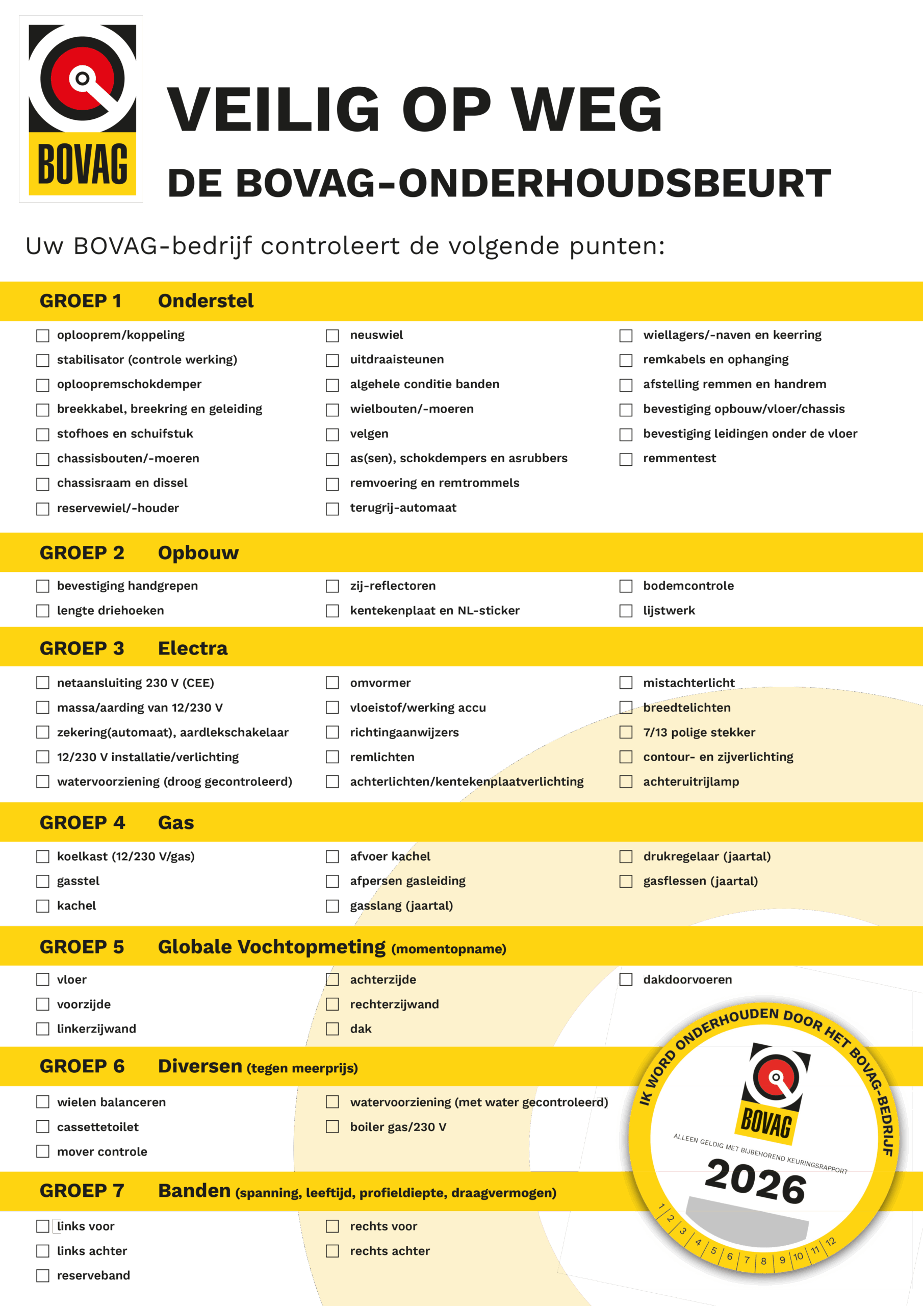 Bij een BOVAG Onderhoudsbeurt gaan onze gecertificeerde keurmeesters aan de slag met meer dan zestig punten, zodat uw caravan, camper of vouwwagen niet alleen voldoet aan alle wettelijke eisen, maar ook aan onze strenge comfort- en kwaliteitseisen.